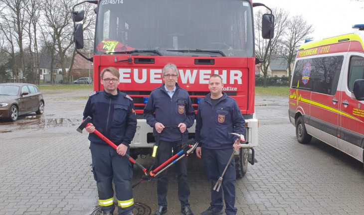 Erfreut zeigten sich Manuel Poppe (li.), Zugführer der Feuerwehr Tostedt sowie Jens Peters (re.), Ortsbrandmeister der Feuerwehr Todtglüsingen über das neue Werkzeug, das Frank Meier in seiner Funktion als 2. Vorsitzendes des Fördervereins an sie übergab.
